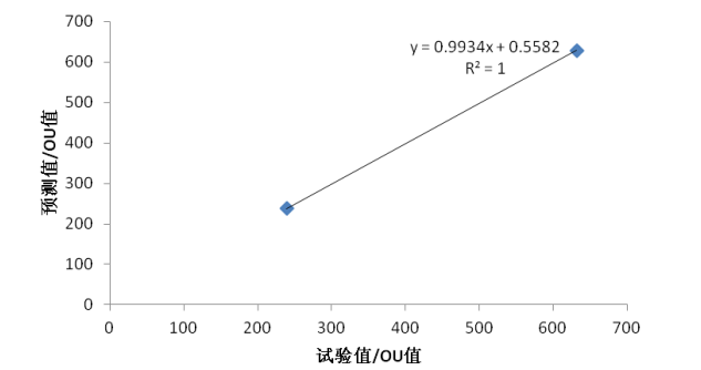 德国 PEN3.5 电子鼻有很大的优势,而且做了大量的跟三点比较式臭袋法对比的实验测试,结果具有很强的相关性和一致性。通过建立针对特定区域的模板文件,可直接得出恶臭强度 OU 值。监测各路段恶臭强度的变化,有利于掌控污染程度,从而有效应对相关投诉。目前,检测恶臭强度的标准方法是三点比较式臭袋法,也是各个领域内使用最多、认可度最多的方法。PEN3.5电子鼻将仪器曲线与以三点臭袋法为依据的嗅辨员数据结合,通过偏最小二乘回归法(PLS)建立适用性强、稳定性好的模板文件,可以对未知样的恶臭强度进行有效地预测。本实验选用样品 5#和 13#,电子鼻检测的恶臭强度预测值分别为 631.5903 和 239.0117,嗅辨员的评价结果分别为 628 和 238,二者的拟合曲线拟合度 R2 为 1 ,达到了完美的预测效果。证明 PEN3.5 电子鼻在预测未知样品恶臭强度 OU 值上准确性极高,有很好的实用价值。